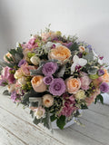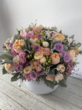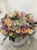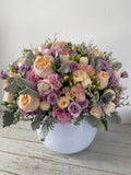 Arreglo floral grande en base de cerámica blanca con Rosas Inglesas, Rosas, Lisianthus, Orquídeas, Hortensias